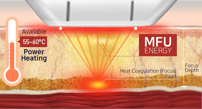 고강도 집속 초음파를 피부 표면 아래 약 3~4.5mm 깊이의